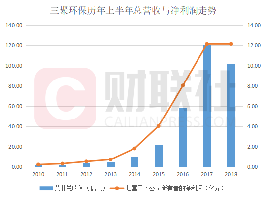 上市后,公司业绩不断走高。2017年上半年,三聚环保总营收为120.85亿,净利润为12.12亿;与七年前同期相比(2010年上半年),总营收增幅为66.89倍,净利润增幅为54.13倍。今年上半年,公司总营收虽然出现下跌,但净利润却仍在增长。下图为财联社根据财报绘制的三聚环保历年上半年总营收与净利润走势: