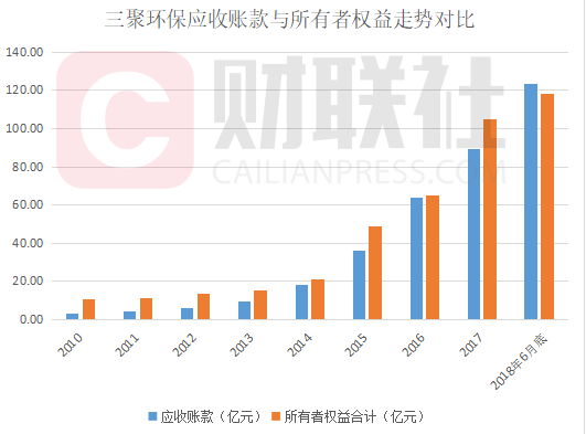 据财报,截至2018年6月底,三聚环保的应收账款为123.44亿,与上年底相比,增加了34.27亿,增幅高达38.41%。事实上,三聚环保的应收账款已超越公司净资产。今年6月底,公司所有者权益为118.07亿,是同期应收账款的95.64%。下图为财联社根据财报绘制的三聚环保应收账款与所有者权益对比走势图: