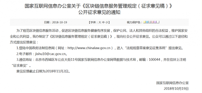 10月19日,据中国政府法制信息网,国家互联网信息办公室发布关于《区块链信息服务管理规定(征求意见稿)》公开征求意见的通知,拟对区块链信息服务进行管理,要求提前备案,实行年检,违规追责。![]()