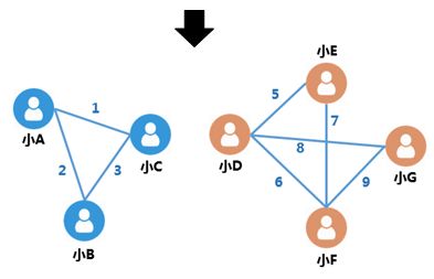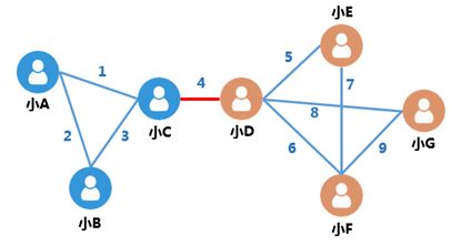以下图为例,小A、小B、小C和小D、小E、小F、小G分别组成两个社群,关系4是这个两个社群的连接节点。小A和小C的最短路径是1,小A和小D的最短路径是1-4。显然,关系4的边缘间距大于其他关系:最短路径经过关系4的节点对包括(小A,小D)、(小B,小D)、(小C,小D)等12对,其他关系的边缘间距最大仅为2。删除掉关系4后,剩下的节点分别聚集成多个社群。