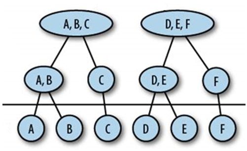 以下图为例,一共有A、B、C、D、E、F等6个节点,其中A和B相似度最高、D和E相似度最高,那么第一步先把A和B、D和E进行聚类合并,然后再比较(A,B)和C、(D,E)、F的相似性,进一步聚类。