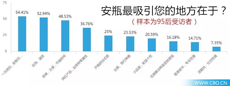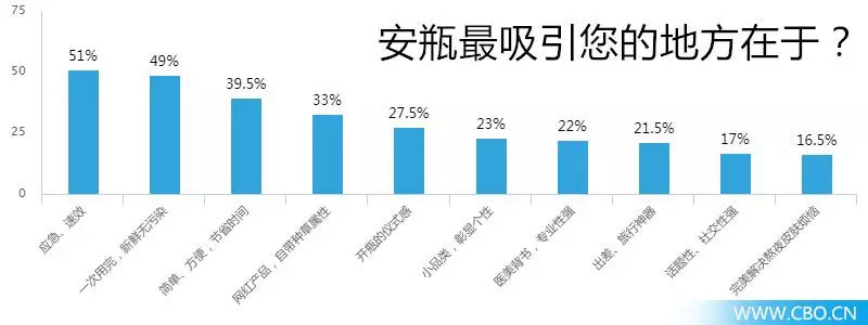 此外,数据还显示,安瓶最吸引90后的前三项分别为:“应急、速效”、“一次用完,新鲜无污染”、“简单方便,节省时间”,选择“应急、速效”的比例为51%,另外两项分别为49%和39.5%。