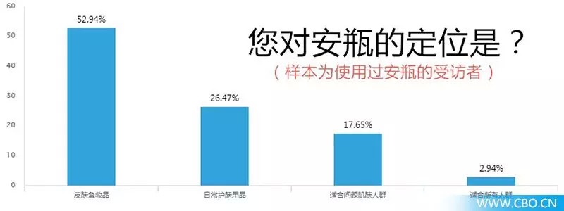 另在安瓶的定位上,有52.94%曾使用过安瓶产品的受访者选择“皮肤急救品”;有26.47%受访者选择“日常护肤品”;有17.65%受访者选择“适合问题肌肤人群”;有2.94%受访者选择适合所有人群。