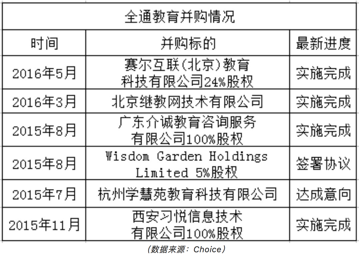 从图中可以看出,相比2014年,2015年-2016年全通教育的营收和归母净利润出现大幅增长,但这并非源自其内生增长,而是与其并购事件不无关系。据统计,2015年全通教育完成了9次并购,2016年完成了4次,其中并购的教育类公司如下: