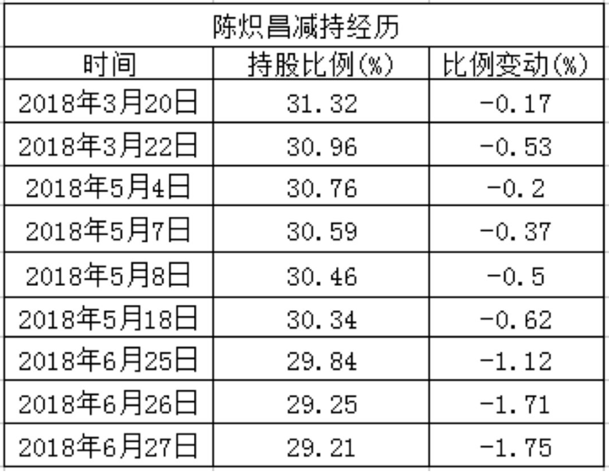 此外,大股东也在不断减持。不仅在股价高位时多次套现,股价下跌时也没有忘记。仅2018年3月到6月,陈炽昌共减持9次。