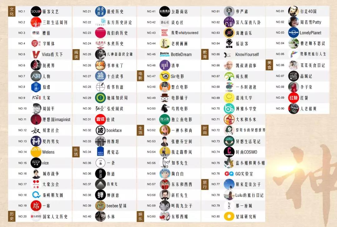 "2018百神+新榜人文自媒体榜单"细分为8个类别:文化、历史、阅读、电影、生活(情感、旅行、乐活)、娱乐、教育、时尚。本次上榜的公众号共计90个,包括六神磊磊读金庸、小林、黎贝卡的异想世界、骚客文艺等。