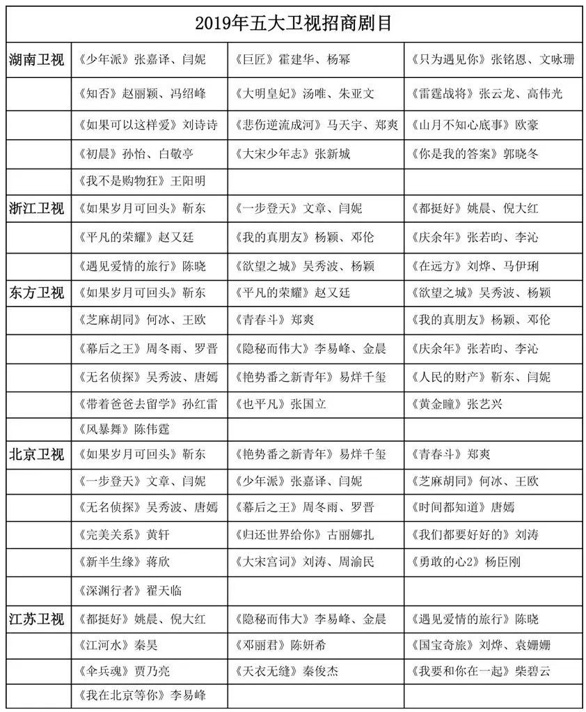 明年各大卫视明显对古装大剧表现节制,从五大卫视公布的招商计划看,目前仅有《知否?知否?应是绿肥红瘦》、《大明皇妃》、《庆余年》、《大宋宫词》、《大宋少年志》、《九州飘渺录》、《绝代双骄》进入待播序列。