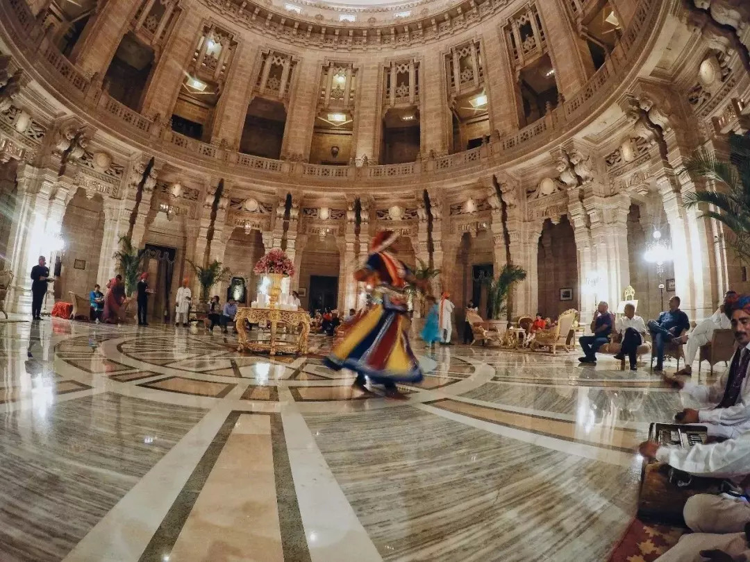 这一段奇幻的人生旅程从穿过皇宫迎宾花园开始。到达门口,会有人为你奏乐,撒花迎接你。每天傍晚6点,在大厅里会有印度传统音乐舞蹈表演。空灵而震撼的歌声,久久在大厅中回荡。