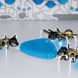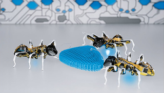 虽然每只仿生蚂蚁都是根据程序计算各自做出决定,但其实它们是为了完成一个共同的目标而扮演着各自的角色。这些小东西会像一个整体那样解决复杂的课题,比如移动比自己体型大很多的物体,而如果只凭借单个蚂蚁的力量,是无法完成这项目标的。在费斯托为这项新发明所拍摄的一部宣传片中,就演示了三只仿生蚂蚁如何协力移动一块蓝色的塑料物体,它的体积看起来比单个蚂蚁要大不少。