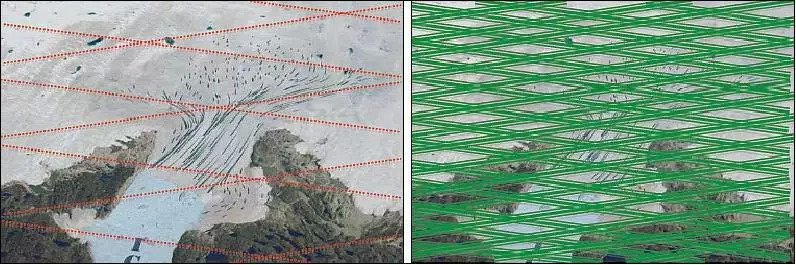 图4 相比于ICESat-1(左),爱斯塞特2号(右)能以更高的网格密度扫描地面。(图片来源:NASA)