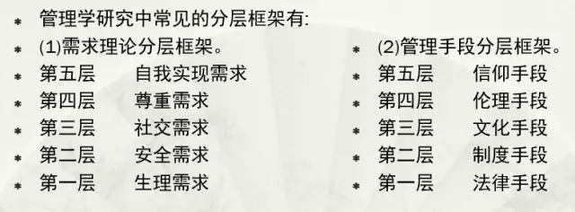 1.线性框架。管理学研究有许多直线性框架。常见的一分为二框架有:双因素理论,分为激励因素和保健因素;人性理论,分为X理论和Y理论;成熟理论,分为成熟和不成熟;组织理论,分为正式组织和非正式组织;决策理论,分为程序化决策和非程序化决策;权变理论,分为机械组织和有机组织。一分为二框架比较为熟悉一分为二思维模式的国人所理解。比如,我们将意识形态分为社会主义和资本主义,将经济体制分为计划经济与市场经济,将所有制分为公有制与私有制,将分配原则分为按劳分配与按资分配等。还有一分为多的方式,在管理学上也有特别多的模型:人性假说四分法,即经济人、社会人、自我实现人、复杂人;管理职能五分法,即计划、组织、指挥、协调、控制;领导方式四分法,即专权独裁型、温和独裁型、协商型、参与型;管理要素七分法,即结构、战略、人员、管理风格、体制与程序、领导观、价值观;竞争力五分法,即供应商交涉能力、购买者交涉能力、潜在竞争者进入能力、替代品替代能力、行业内竞争者现有竞争能力等。