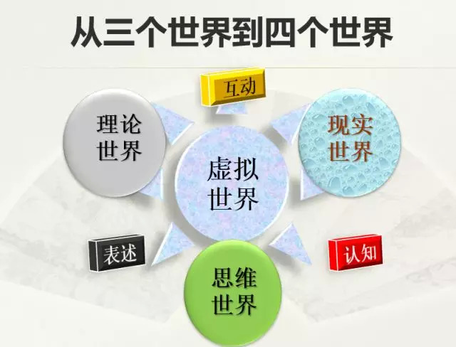 从三个世界到四个世界,就是在虚拟世界里面照样会产生许多的事物,你不是你,虚拟世界还有一个你,那个云里的你比现在的你更真实。人类的表述、互动和认知,所有东西都是互相连着的。世界动不动,看你动不动,虚拟的世界是通过你的眼睛和脑子连起来考虑的问题。