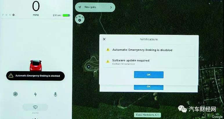 工程师在跑道上测试时,发现AEB系统也不能工作,在即将发生碰撞前AEB不能启动时,汽车中央屏幕上才会出现警告,提示司机AEB系统不可用。