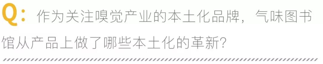 A:我们跟传统行业的东西长得一点都不像,也不借鉴他们的想法,靠抄解决不了我们的野心,我们一直以来靠不同物种的特性来吸引自己,让自己变异。相较于外国人,香水对于中国人来说是可有可无的非必需品,但作为中国的消费者,他们要的不仅仅是香气,而是香味背后的情怀。我将气味图书馆定义为记忆和情感的载体,因为这里充满了各种各样生活的气息,像我们推出的“凉白开”、“姜丝可乐”、“绿茶”、“竹林微风”等等味道都非常受欢迎,这些味道,可以唤醒每个人最熟悉的记忆。