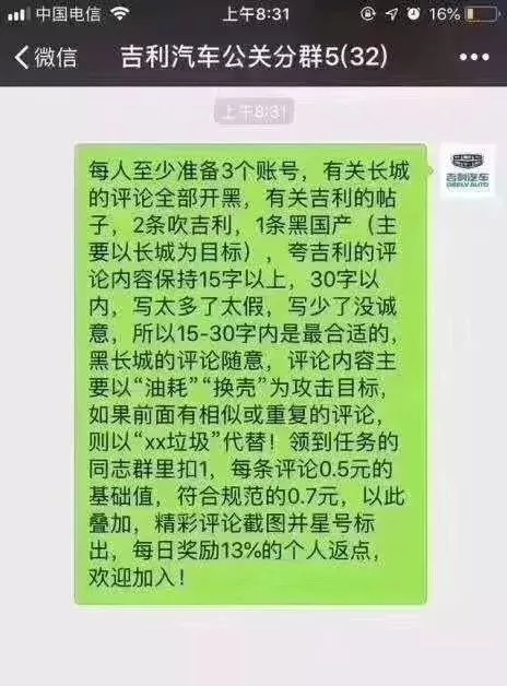 而被水军、假新闻所害的近来还有长城汽车和同样被称为受害者的吉利。