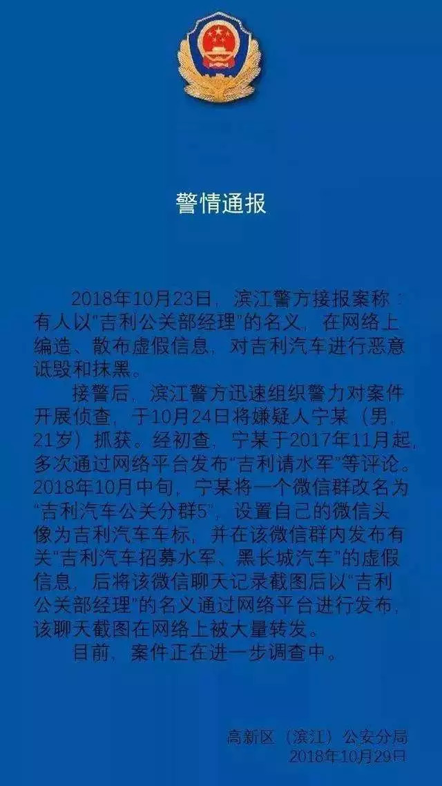 而在同日上午,平安滨江微博在发布的一份警情通报中称:已于10月24日将犯罪嫌疑人宁某抓获。也就是吉利汽车“黑公关”的嫌疑人抓获。