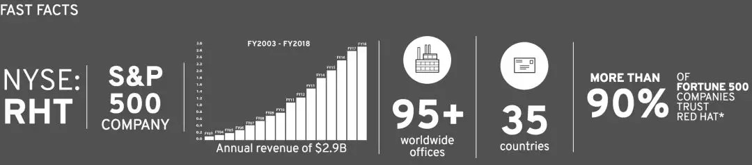 到了今天, Red Hat 已经被列为纽交所 500 强企业,年收 29 亿,而且在全球 35 个国家有 95 家办公室。