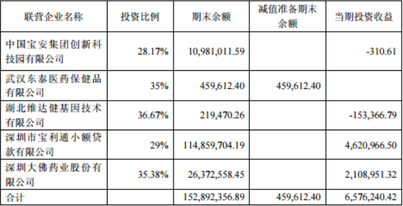 从财报上看,马应龙有几笔长期股权投资。从长期股权投资构成上来看,马应龙共有五家联营企业,按照金额大小排序分别是深圳市宝利通小额贷款有限公司、深圳大佛药业有限公司(下称“大佛药业”)、中国宝安集团创新科技园有限公司、武汉东泰医药保健品有限公司、湖北维达健基因技术有限公司。