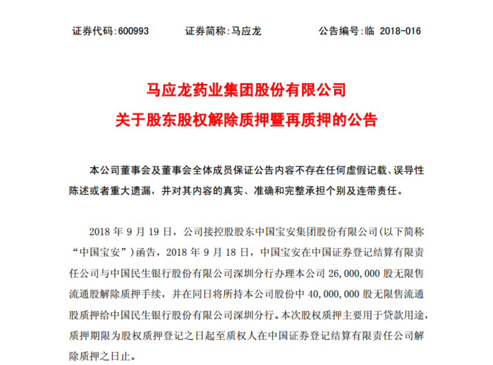 而且从总体来看,蕴藏风险更高的是之前在股价高位处的两笔股权质押,在2017年10月12日和2018年1月25日,中国宝安分别将5000万股无限售流通股和2100万股无限售流通股质押给招商银行股份有限公司深圳分行和中国银行股份有限公司深圳市分行。在上述两个质押日马应龙对应的收盘价分别为20.59元/股和20.40元/股。截止到2018年10月30日收盘价下跌幅度均为32%左右。由于股票质押贷款属高风险贷款业务,为控制股价波动带来的未能偿付风险,质押方往往会设立警戒线和平仓线,每个券商的警戒线和平仓线会有一些差异,保守一点的券商会将警戒线和平仓线设置为160%和140%。这也就意味着一旦股价下跌到一定幅度,将会触发强制平仓。