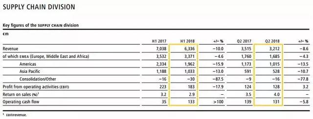 此外,根据2018年上半年经营数据,DPDHL的供应链业务有较大幅度下滑,其中美国和亚太业务下滑严重,同比分别下降15.9%和13%。