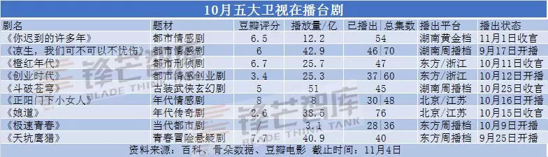 在统计10月在播网剧和五大卫视在播台剧时,笔者发现:当视频网站已经达到题材“细分众化”时,台播剧却还停留在如何将剧集“年轻化”中。10月网剧的整体口碑要比台播剧高,11月又将会有哪些新剧参与对战?