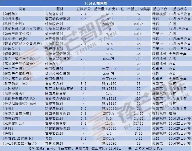 纵观10月在播网剧的播出状态,可称之为“收官之月”。对于更新周期本就快速的网剧而言是再正常不过的事。结束便意味着新的开始,十月的台播剧在播放量和口碑的整体上比网剧稍逊一筹,11月又会迎来哪些新剧对战?
