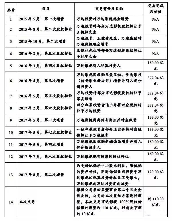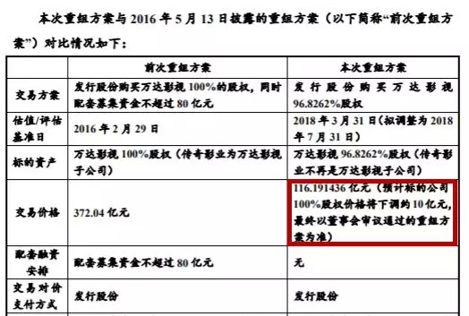 2016年5月,万达电影拟作价372亿元以发行股份的方式购买万达影视100%的股权,但受资本市场等影响而被迫终止;2017年7月万达恢复重组以来一直未能公布新重组预案,直到今年6月才发布公告称,拟作价116亿以现金加股权的形式收购万达影视96.8262%的股权;而今第二次调整,价格又下调了10亿元。