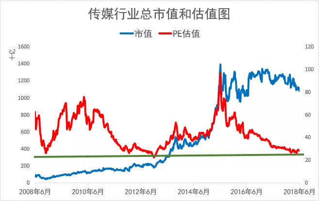 2017年万达停牌时,传媒板块正处在一个低潮期,行业整体估值仅有31倍PE,板块涨幅连续位居倒数第二。可没想到进入2018年后,下限又再度被突破,截至10月,影视板块估值的中位数已从历史最高的73倍PE(2015年)降至18倍,和2012年底传媒行业历史底部估值水平相当。而Wind统计则显示,万达电影停牌以来,文化传媒指数跌幅达46%,其中今年的跌幅则达到36.6%。