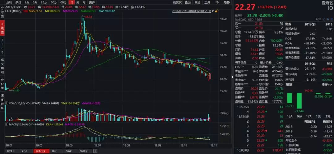 第三季度净亏损31亿元,使得爱奇艺盘后大跌13%。第二天开盘爱奇艺股价重挫11.53%,交易量较前一日扩大220%。之后一天,随着中概股的集体走高,爱奇艺又上涨了13.4%,上周五,爱奇艺收盘跌幅5.1%,股价回到21.1美元。