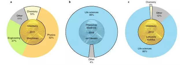 但是物理和生命科学呢?尽管在过去的几十年里,这些领域也发生了根本性的变化,例如,生物物理领域的跨学科研究日益增加,但在这些领域获得诺贝尔奖的研究的影响仍然局限在本学科。