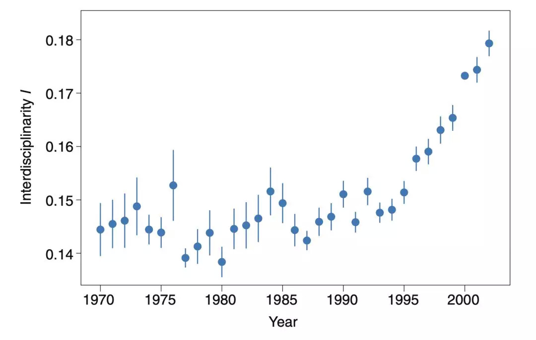 随着时间的推移,通过定义一个跨学科影响的度量,并测量前10000篇论文的跨学科性,从中可以发现:自上世纪90年代中期以来,在不同领域产生平衡影响的研究一直在稳步增加。