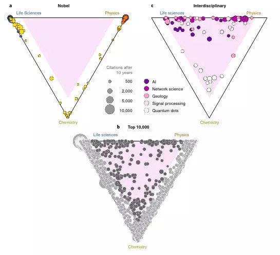 所有获得诺贝尔奖的论文都位于连接物理-化学和化学-生命科学这两条边的狭窄区域中。在阴影区域内的文章没有获得诺贝尔奖,这些文章代表的是这个狭窄范围之外的想法。换句话说,对这三个学科都有影响的工作没有被颁发诺贝尔奖。特别是,有证据表明在物理-生命科学的交叉领域缺乏奖项。