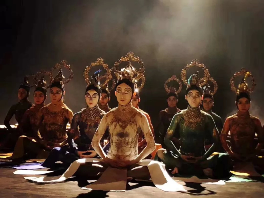 所以杨丽萍用藏族元素,东方元素来做《春之祭》的主视觉,这个创意国内外的人都很吃惊。特别是服饰和脸妆:《春之祭》服装是否要遵循唐卡里面的服装,如何改动,而不是直接搬过来,《春之祭》的献祭的少女,她先开始是神,然后成为人,最后你掌握自己的命运,你又成为神。从服装的层面,比如有神对应的符号或头饰,把衣服一脱就是人,就是解掉一个符号,把头饰拿了,把裙子一脱就变成一个妇女,变成一个凡人,芸芸众生,然后经过,他又变成了神。因为来不及换衣服,必须在一套套衣服上做文章。