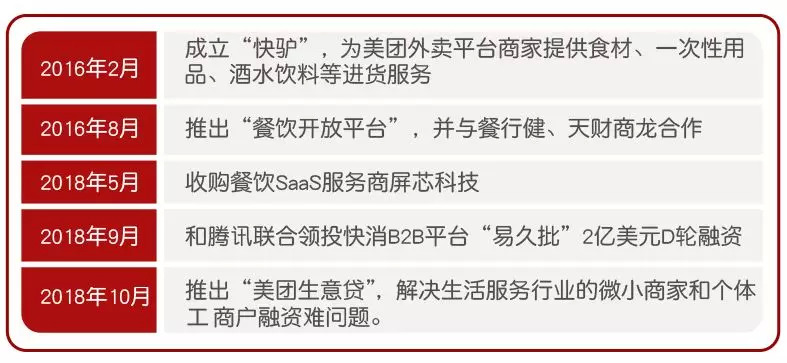 早在两三年前,美团已经秘密布局了多个to B的业务,食材供应链、平台、SaaS软件、贷款等皆有涉及,进入2018年后这一节奏明显加速。