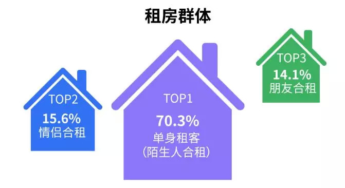 数据显示,在租房群体中,除一家人合租之外,单身租客占比超七成(70.3%),其次为情侣合租(15.6%)及朋友合租(14.1%)。