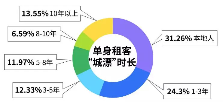 而在单身租客中,68.74%为外来谋生奋斗的“城漂族”。其中,城漂时长1-3年的占比最高,达24.3%;其次为10年以上和3-5年,占比分别为13.55%和12.33%。