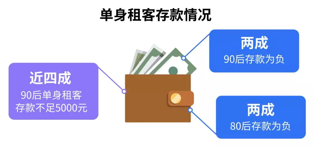 2、在租房群体中,单身“城漂族”占比超过七成,其中近四成90后单身租客存款不足5000元;