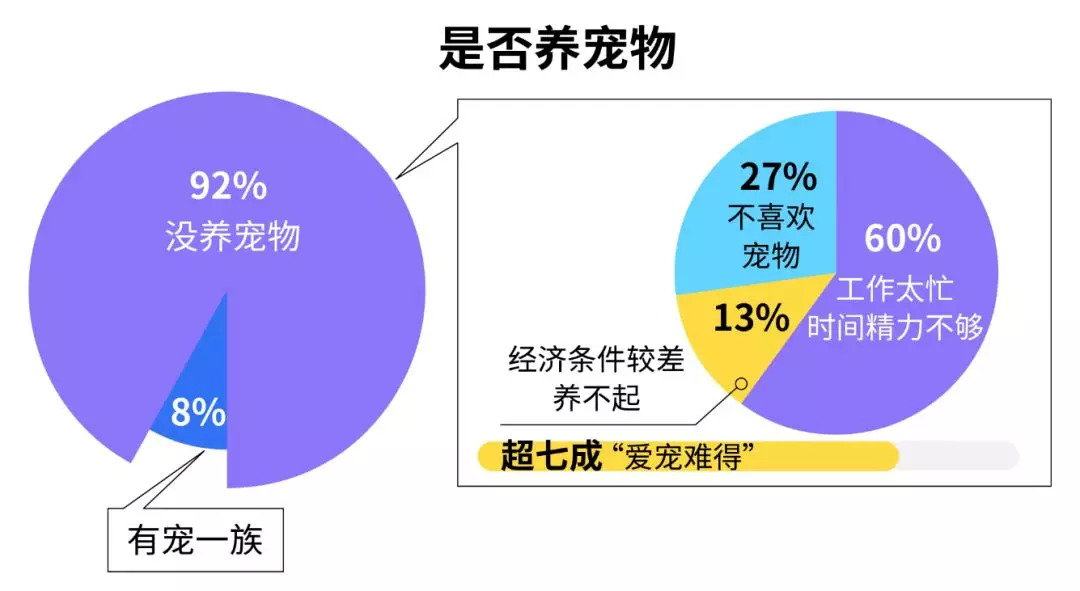 同时,随着“吸猫撸狗风”的兴起,养宠物成了单身租客们排解孤独和压力的一种方式。调研发现,尽管单身租客中的“爱宠族”不在少数,但“有宠一族”仅占8%,超九成租客没养宠物。其原因分别为:“工作太忙,时间精力不够”(60%)、“经济条件较差,养不起”(13%)和“不喜欢宠物”(27%)。可见,超七成的租客“爱宠难得”。