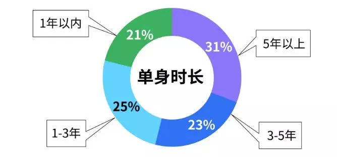 调查发现,单身租客中,单身时间5年以上的租客占比高达31%,单身3-5年的租客占比23%,单身1-3年的租客占比25%,而单身1年以内的租客占比21%。