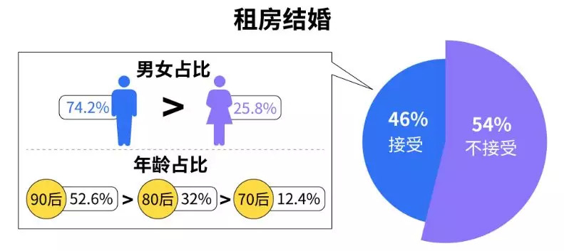 对于租房结婚,54%的租客表示不接受,46%的租客表示接受。而在接受租房的人群中,男性比例(74.2%)远远高于女性(25.8%)。90后对于租房结婚接受度最高,接受人群占比高达52.6%,远超70后(12.4%)和80后(32%)。