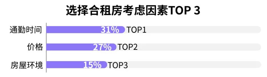 此外,随着越来越多城市步入“堵城”,交通也成为影响单身租客最重要的因素。数据显示,单身租客选择合租房时,首先考虑的就是通勤时间(31%),其次为价格(27%)和房屋环境(15%)。
