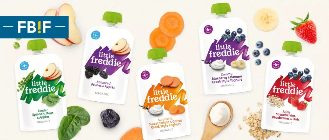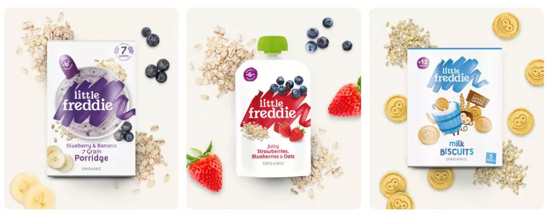 左起分别为Little Freddie谷物食品、育儿袋食品、婴儿零食