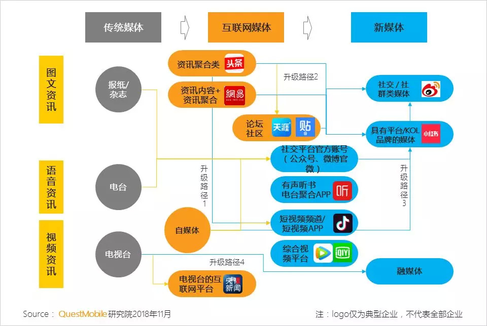 资讯渠道的升级:从单一形态到多形态聚合,逐渐形成平台或KOL品牌获得用户粘性,以资讯聚合类平台多资讯形态强势发展、以传统媒体向融媒体转型和以知名品牌自媒体为代表。