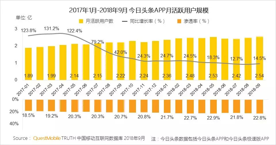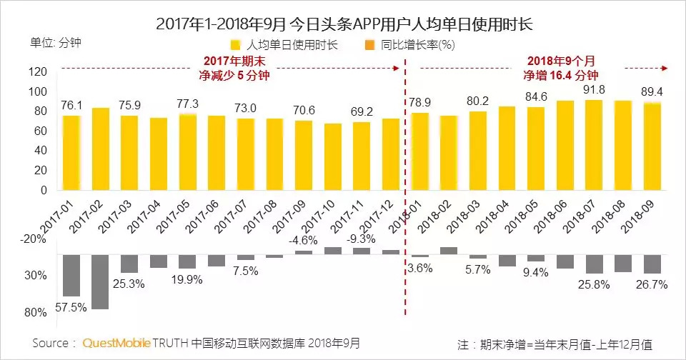 用户对今日头条的依赖在增强,月活跃用户规模持续增长,截止今年9月,相比上年期末,其人均单日使用时长净增16.4分钟。