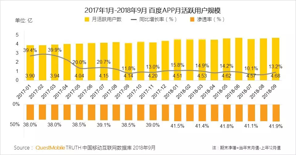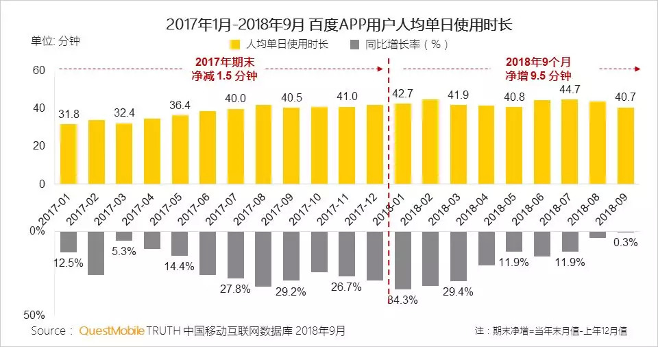 QuestMobile数据显示,百度APP用户较去年期末人均单日使用时长增加9.5分钟。