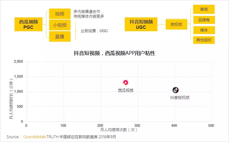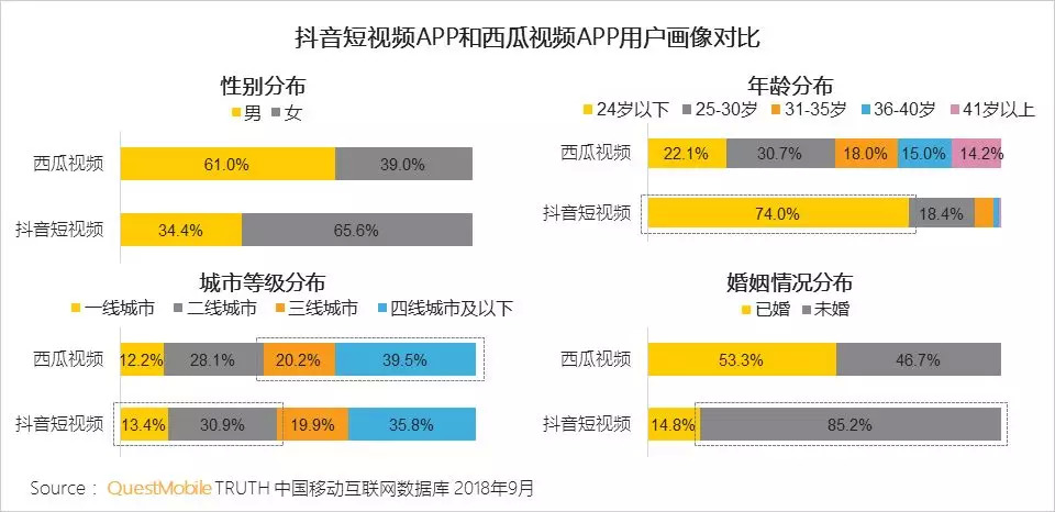 以UGC为主的抖音短视频用户更偏都市年轻群体,社交属性更明显,以PGC为主的西瓜视频用户特征更趋向移动网民整体特征。