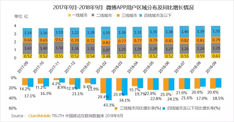 以微博APP为代表的社交类媒体,用户区域分布进一步下沉,社交类媒体通过区域下沉寻求新的增长渠道,拓展盈利模式。