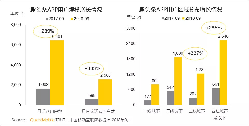 QuestMobile数据显示,2018年9月趣头条APP月活跃用户规模超5000万,三线以下城市用户规模同比增加三倍。