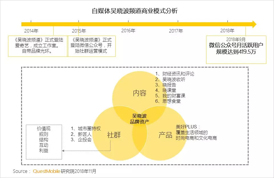 以吴晓波为代表的自媒体,形成内容、社群、产品三位一体,并打造基于IP的产品矩阵。