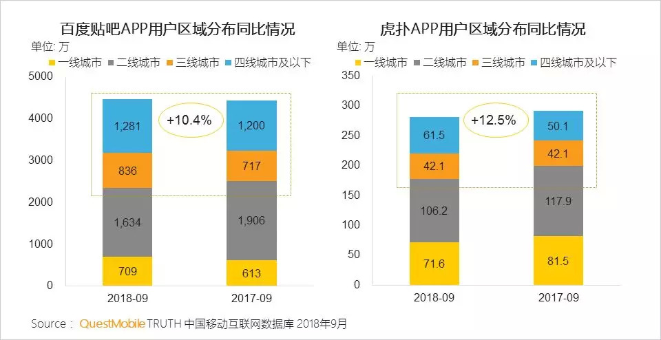 以百度贴吧、虎扑为代表的论坛类社交媒体在区域分布上进一步下沉,拓展下线城市的用户社交关系链。